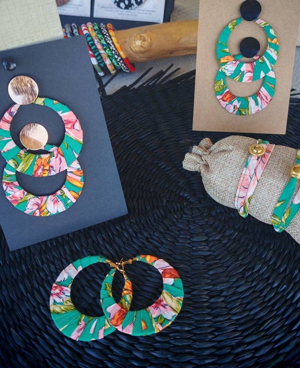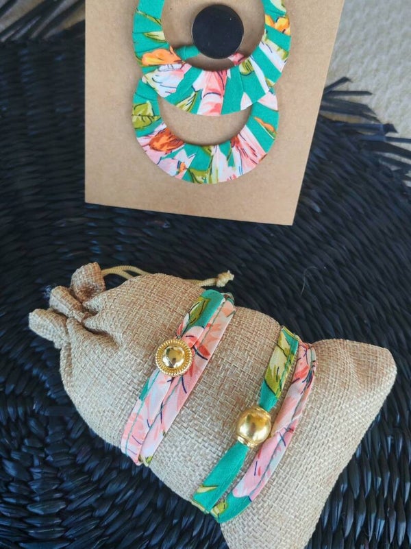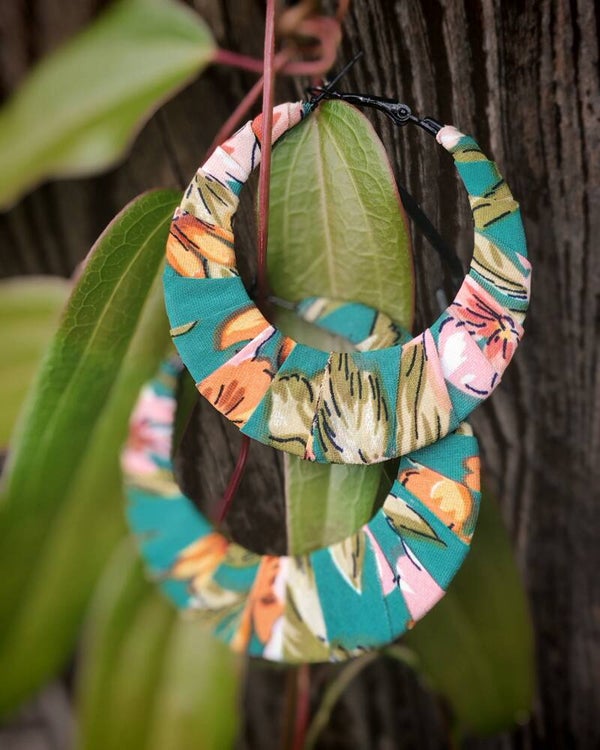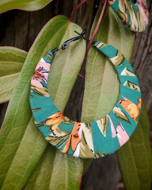 Créoles diamètre 6 cm en tissu de seconde main vert tendre motif floral tropical orange et rose poudré, fermoirs et tailles au choix
