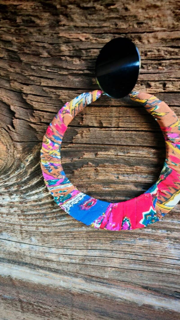 Créoles upcyclées dans un imprimé vintage arabesques bleu et rose avec fermoirs hypoalergéniques noirs laqués