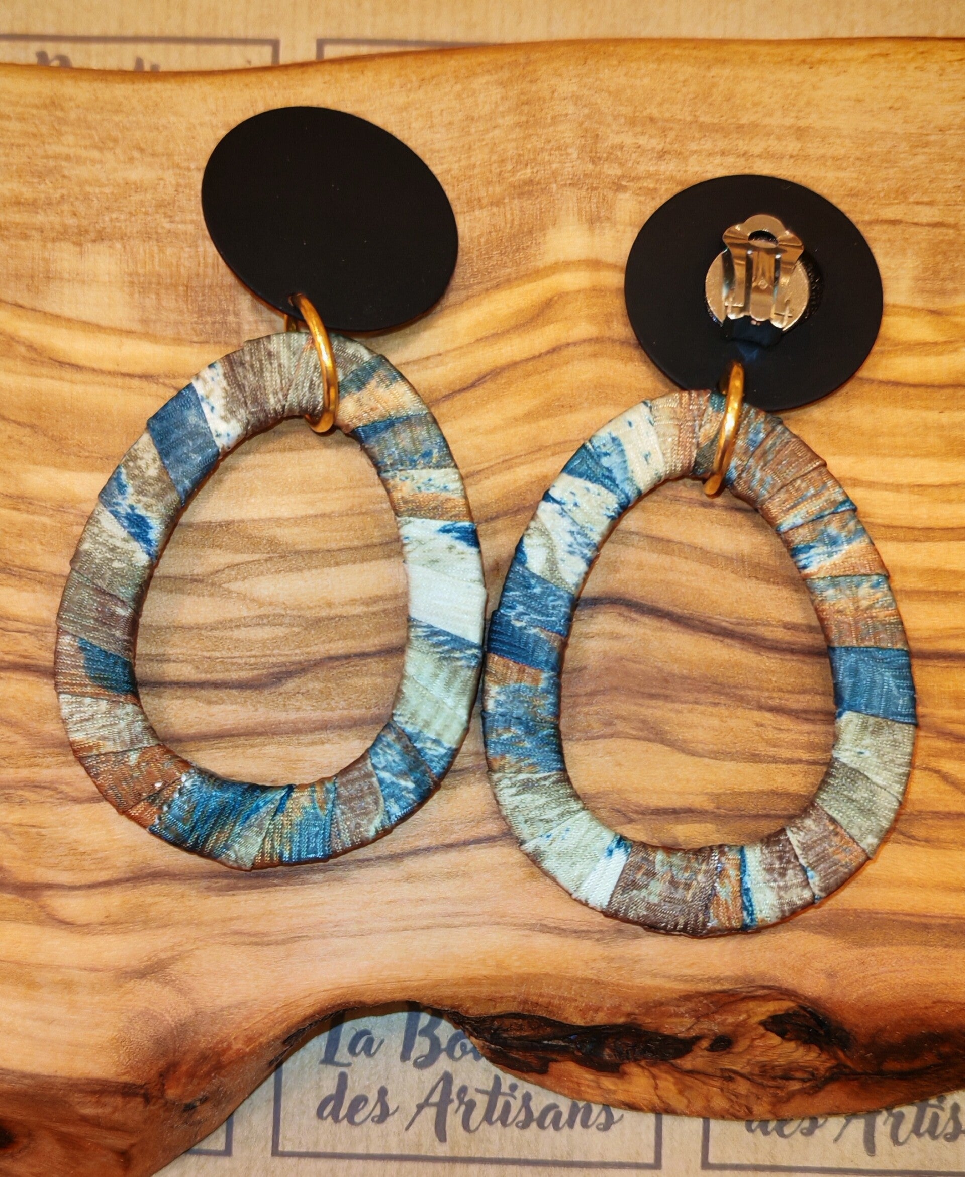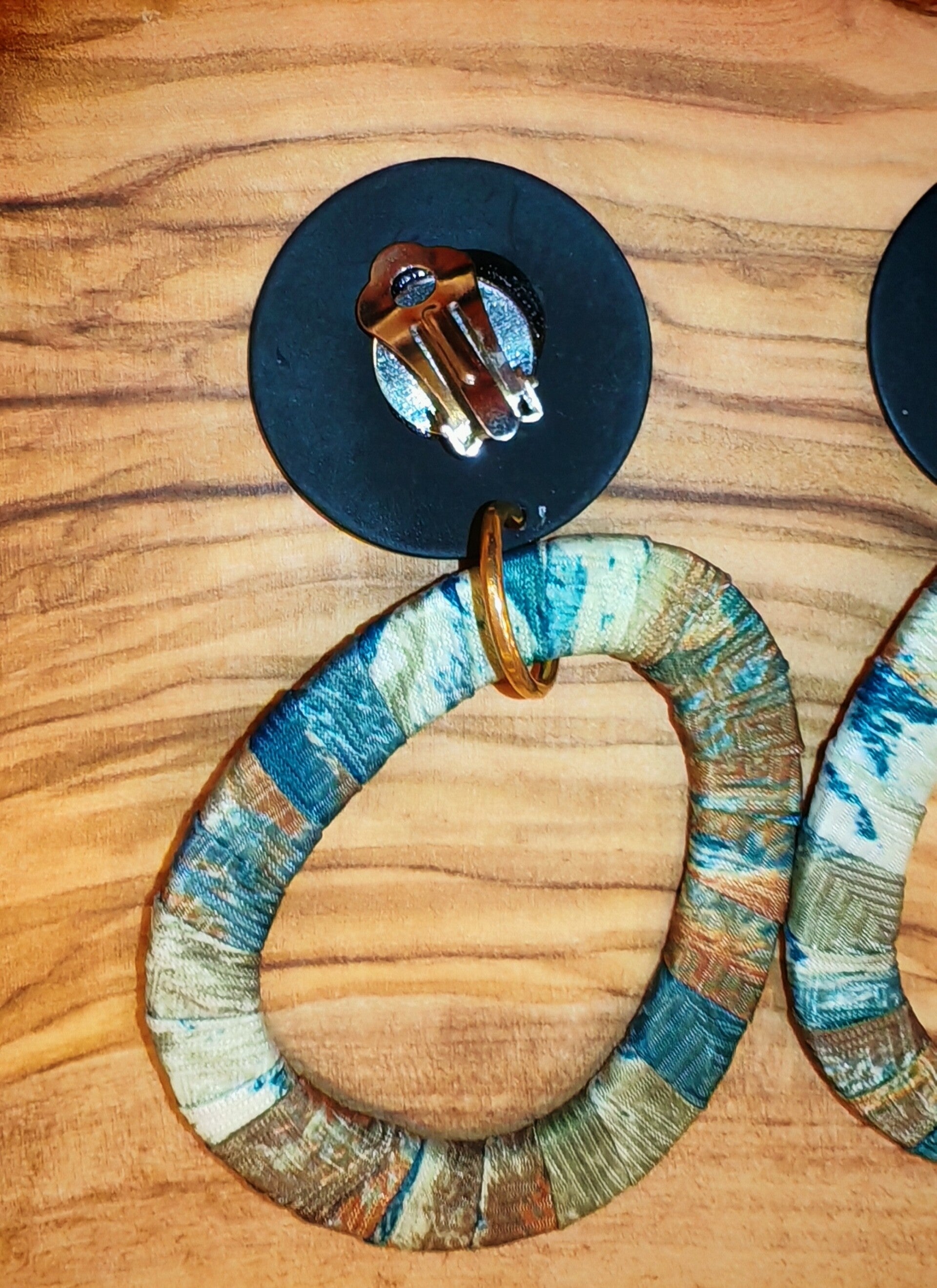 Création unique pour cette paire de créoles upcyclées à partir de tissu de seconde main sur fermoirs clips noirs mats.