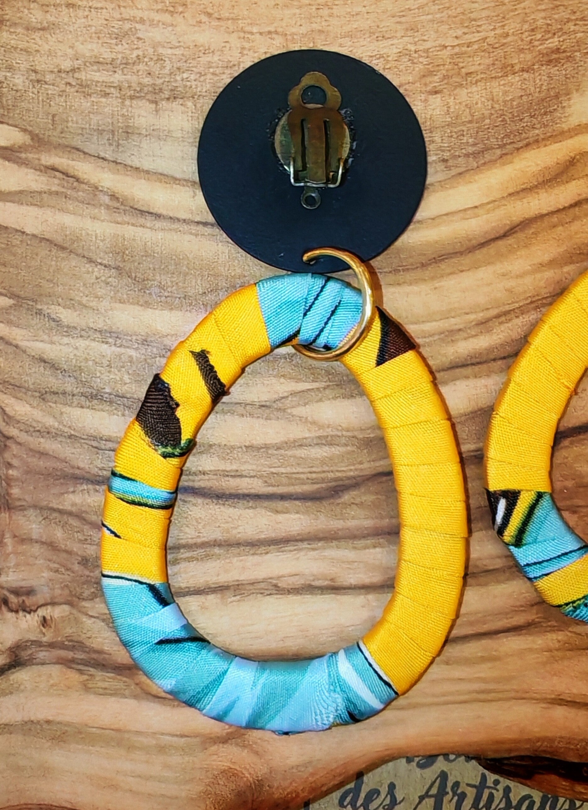 Créoles upcyclées dans du tissu de 2nde Main jaune, création unique sur clips noirs mats, très légères