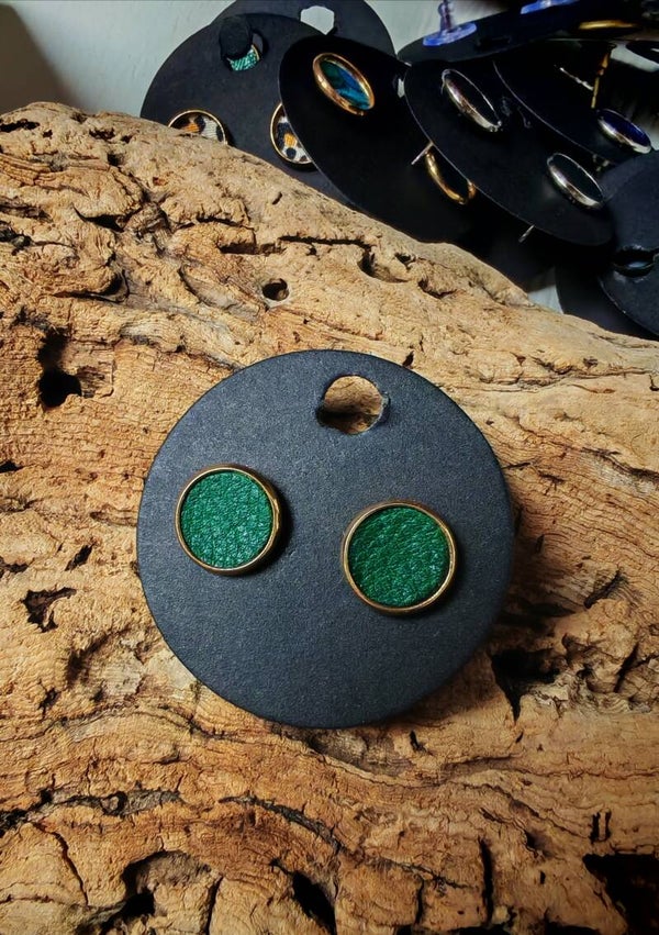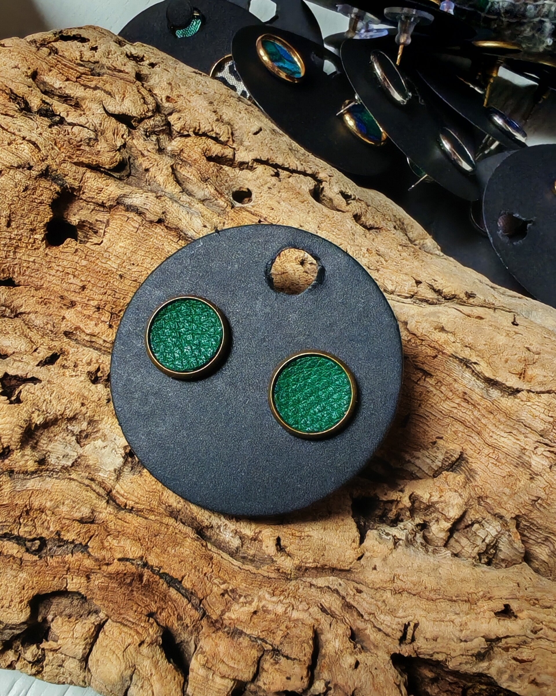 Boucles d'oreilles puces en acier inoxydable pour oreilles percées, cuir vert sapin.Diamètre 1cm