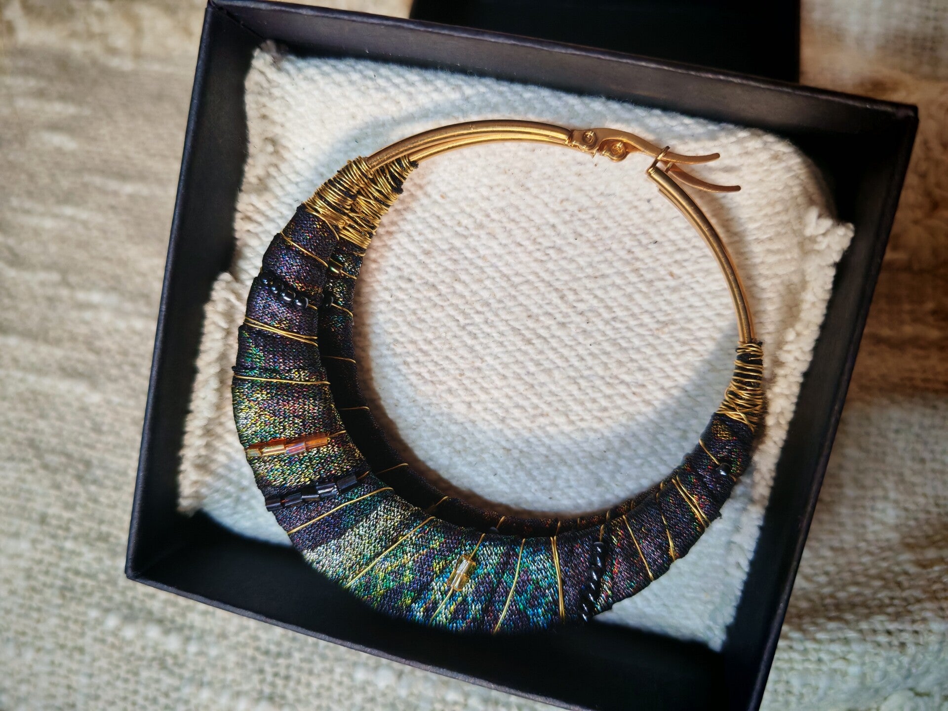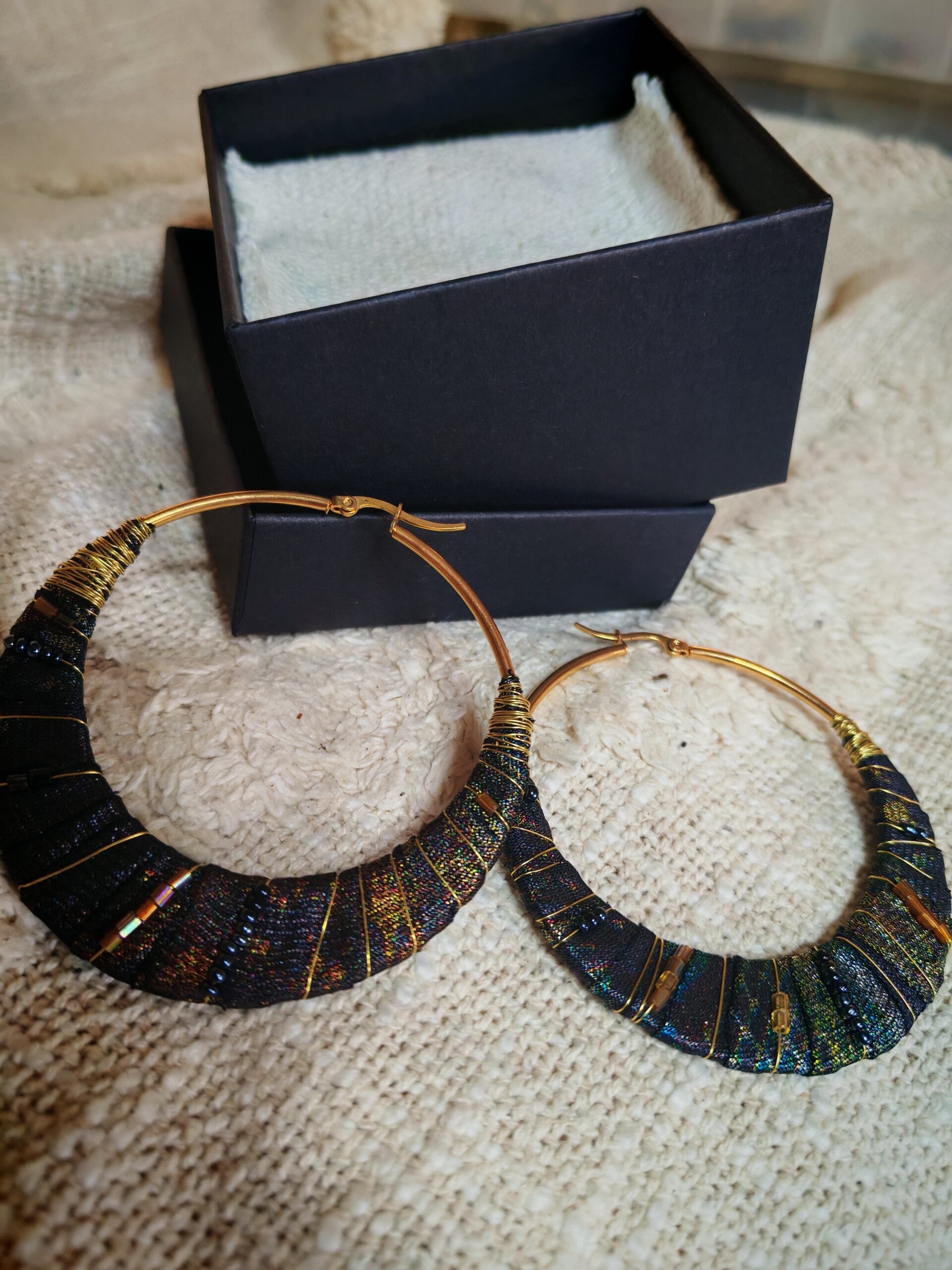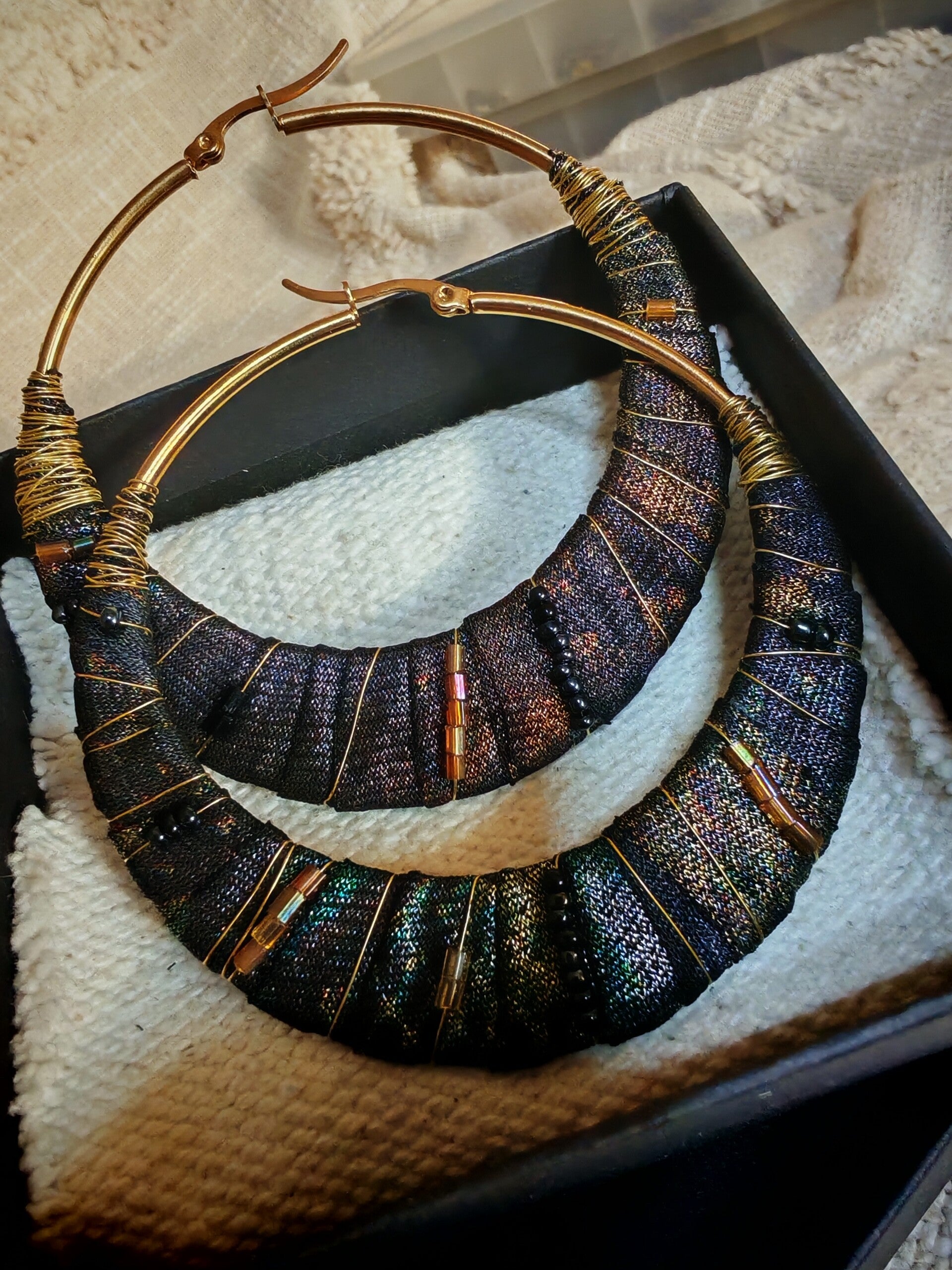 Coffret chargé d'histoire avec cette paire créoles uniques diamètre 7cm, tissu d'antan rehaussé de Quelques perles de rocailles chinés, le tout sur une base acier inoxydable doré ✨ Marre de voir toujours les mêmes créoles, alors voici les vôtres, 100 % unique et authentique ✨♻️